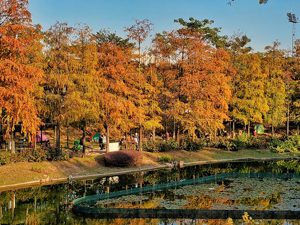 青衣公園採用了歐陸式設計,園內的桃花園鄰近八號閘,每憑新春期間有不少桃花開放。園內人工湖中載種了荷花,湖旁栽種了水杉、水松、落羽松及楓香等落葉樹種,每逢秋冬時,樹木會變成一片紅及金黃色,吸引不少喜愛攝影者拍攝。